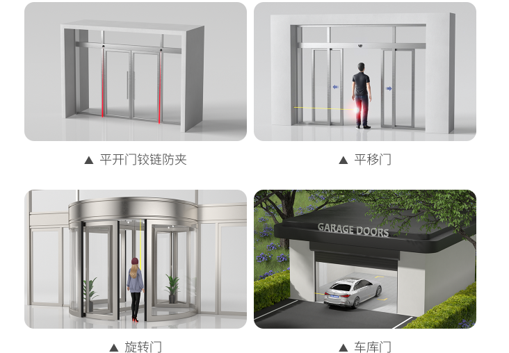 可用于平开门铰链防夹、平移门、旋转门、车库门等多种门型防夹。